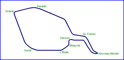 NOUVEAU MONDE: Trecho dos mais interessantes e também dos mais filhos da puta. Antes dele, o piloto completa uma curva à esquerda parecidíssima com a curva 2, inclusive com direito ao barranco assassino do lado direito. Completada esta parte, o piloto se aproxima do trecho mais lento de Rouen. A Nouveau Monde propriamente dita é um cotovelo feito à direita em primeira marcha. É praticamente a única parte da pista onde o piloto é realmente obrigado a enfiar o pé no freio. Há uma pequena área de escape ao fundo.